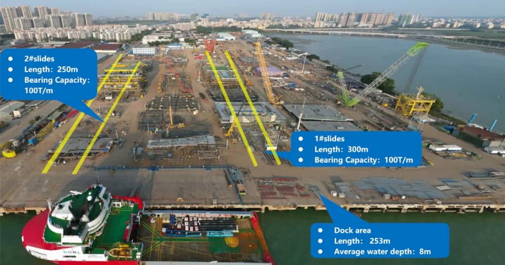 The Site has 2 slides to meet the construction of various marine engineering modules, and also has the ability to drag and load modules up to 5000T and SPMT cars for loading. The site also has 253m shoreline dock resources, meeting the requirements for 20000 ton barge berthing.