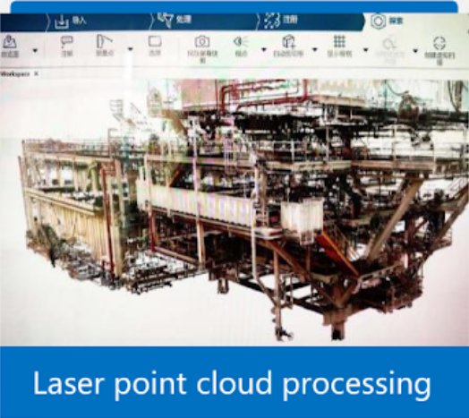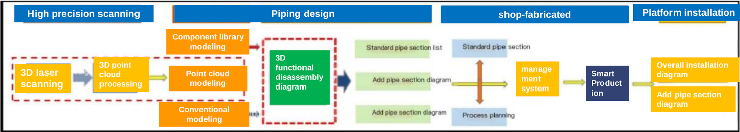 By introducing 3D laser scanning and point cloud data processing technology, an accurate 3D point cloud model is formed to assist in the design and calibration of platform renovation. It is also linked to the digital prefabrication production line of pipelines to improve the ground prefabrication rate and accuracy, effectively reducing the construction and installation time inside the platform.